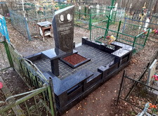 Дождавшись окончательного высыхания брусчатки вновь приезжаем на участок. Там мы восстанавливаем надписи на надгробье, размещая у его подножья восьмиконечный крестик. На этом наша работа на данном участке окончательно завершена. В результате из ничем не примечательной могилы появился презентабельный мемориальный комплекс, декорированный столиком и двумя лавочками в оградке.