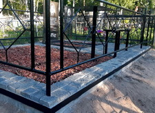 Уложив периметр, мы застелили территорию места захоронения геотекстилем, и выложили брусчатку вокруг памятников, предварительно установив лавочку со столиком.